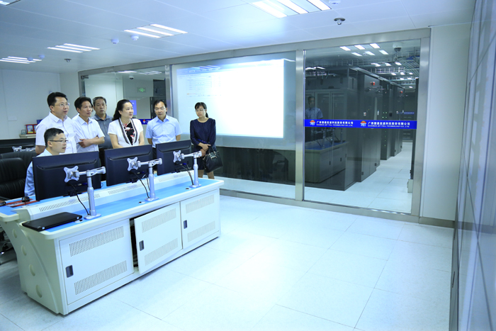 黃敏(前右二)一行在廣西ETC數(shù)據(jù)中心機(jī)房調(diào)研,朱堅(jiān)和(左二)、張友坐(左四)、鄧遠(yuǎn)志(右一)陪同。
